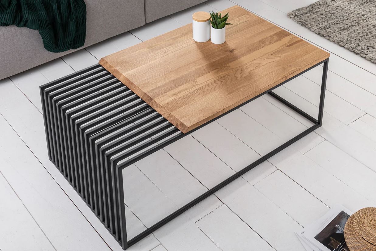 Masuța de cafea este o piesă distinctivă care îmbină aspectul industrial cu cel modern, cu o structură metalică vopsită în câmp electrostatic. Blatul din stejar masiv de cea mai bună calitate adaugă căldură și textură, contrastând în mod elegant cu aspectul metalic al bazei. Această masuță de cafea nu numai că servește scopul funcțional al unei mese de cafea, dar adaugă si un element de design interesant și sofisticat în orice încăpere.