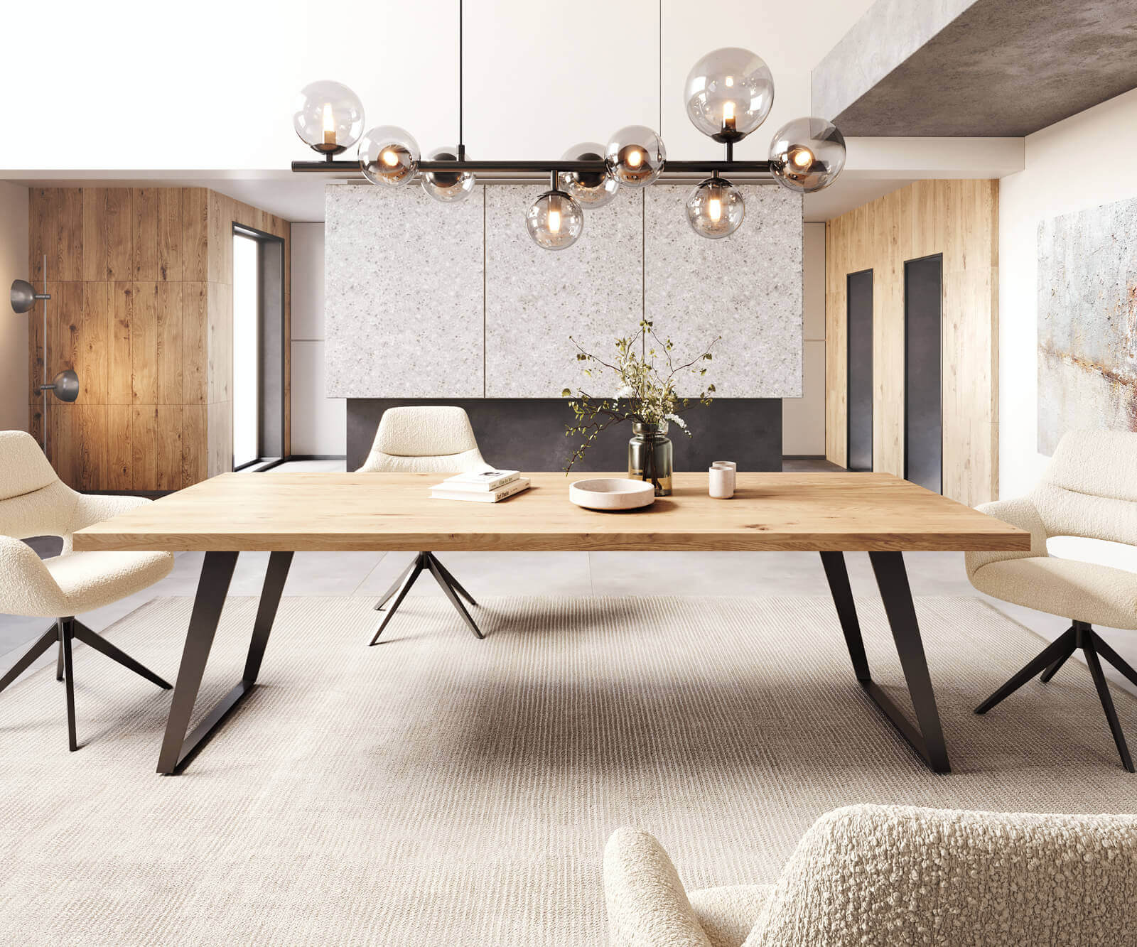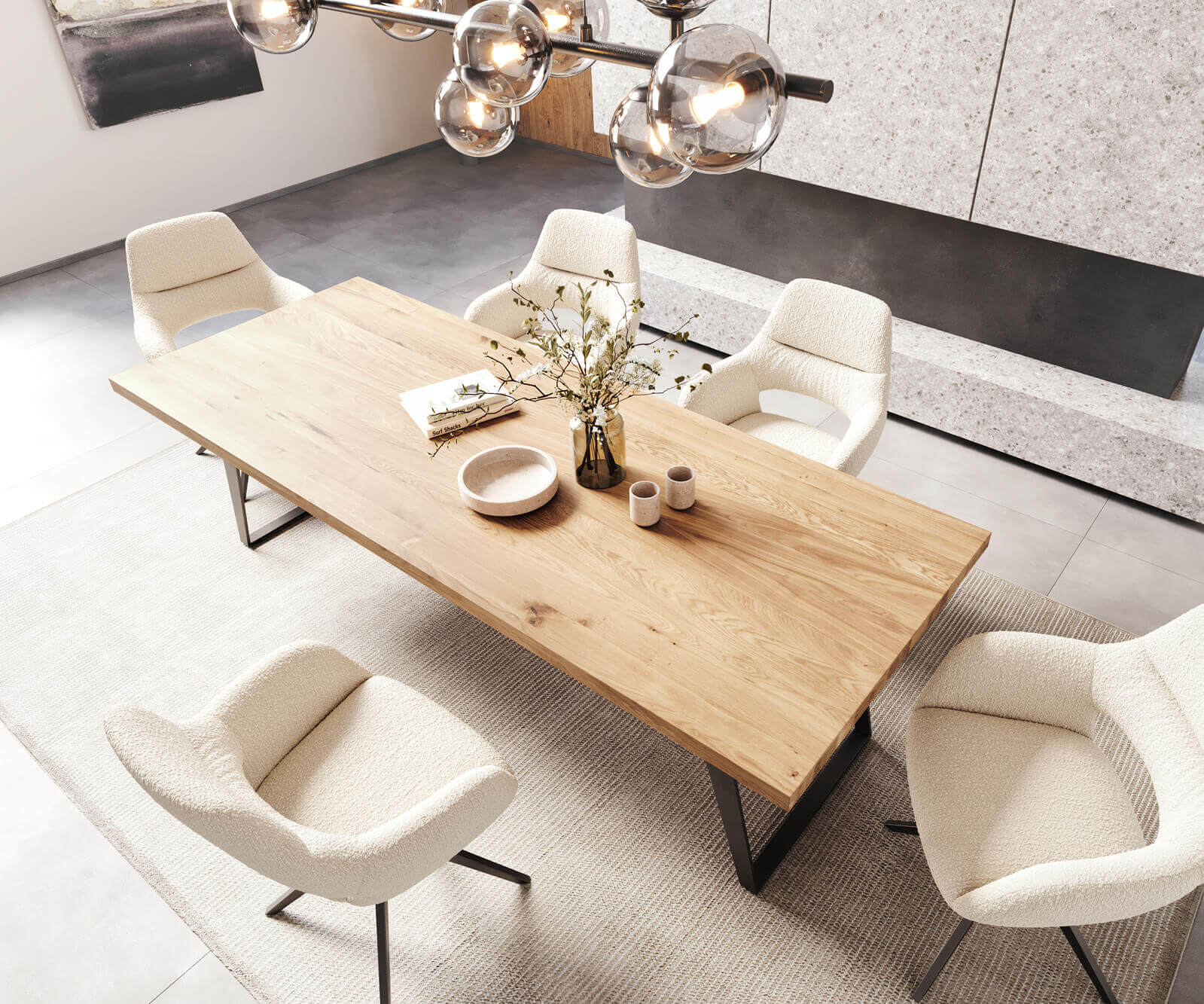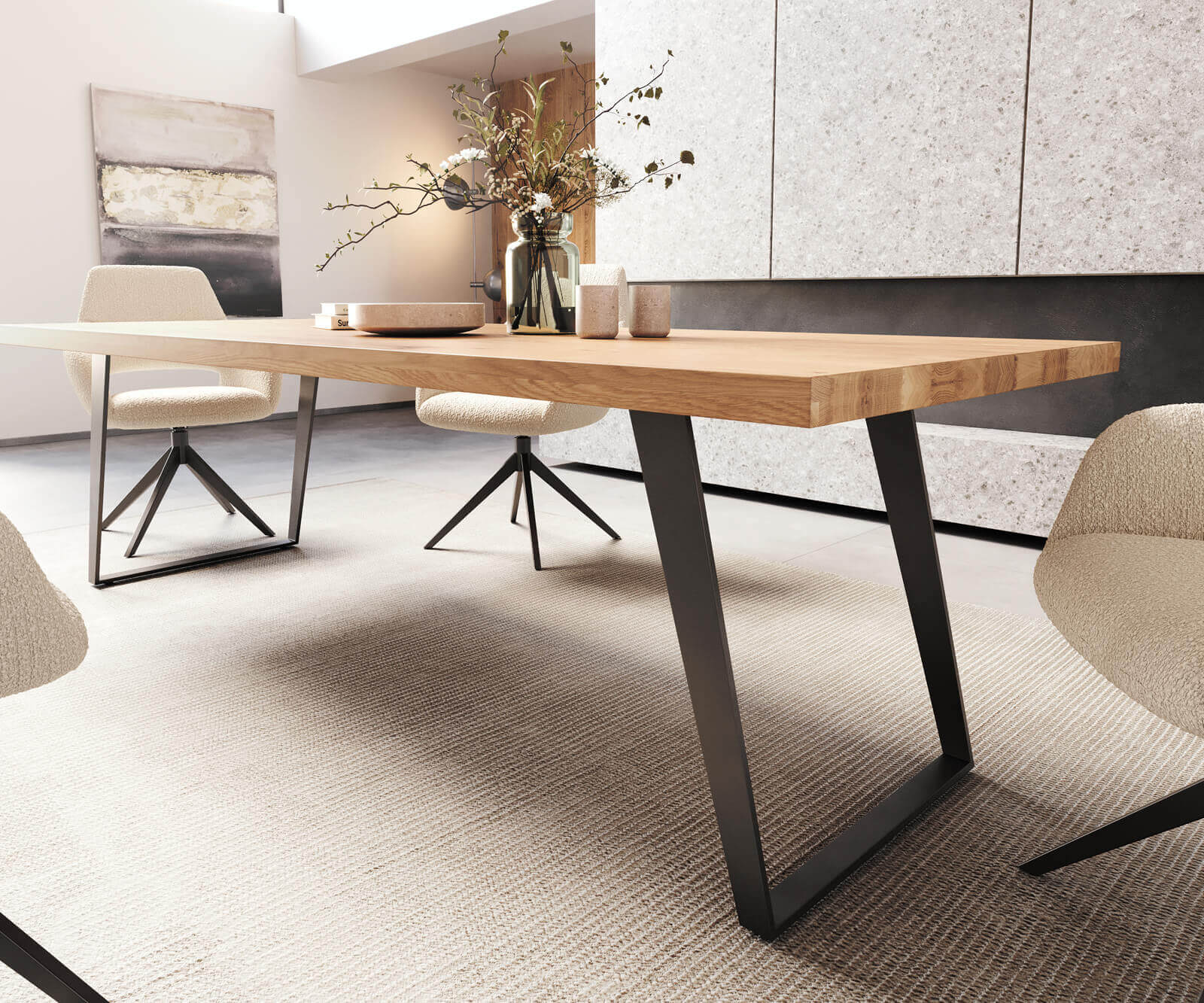 Masa de dining din stejar masiv este o piesă de mobilier elegantă și durabilă. Blatul mesei este confecționat din lemn de stejar masiv, oferă o textură naturală și o calitate solidă. Picioarele metalice sunt vopsite în câmp electrostatic care asigură rezistenta și stabilitatea în timp, având totodată un aspect modern și rafinat. Această masă este potrivită pentru diverse stiluri de decor, aducând un aer de eleganță și rafinament în orice încăpere.